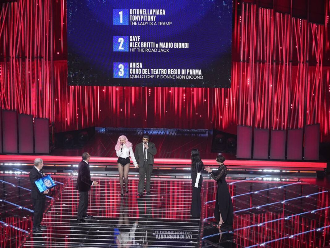 La serata ha visto trionfare la coppia Ditonellapiaga e TonyPitony, che, attraverso una coinvolgente interpretazione di The Lady is a Tramp, ha unito l’eleganza del jazz allo stile dance pop di Lady Gaga.